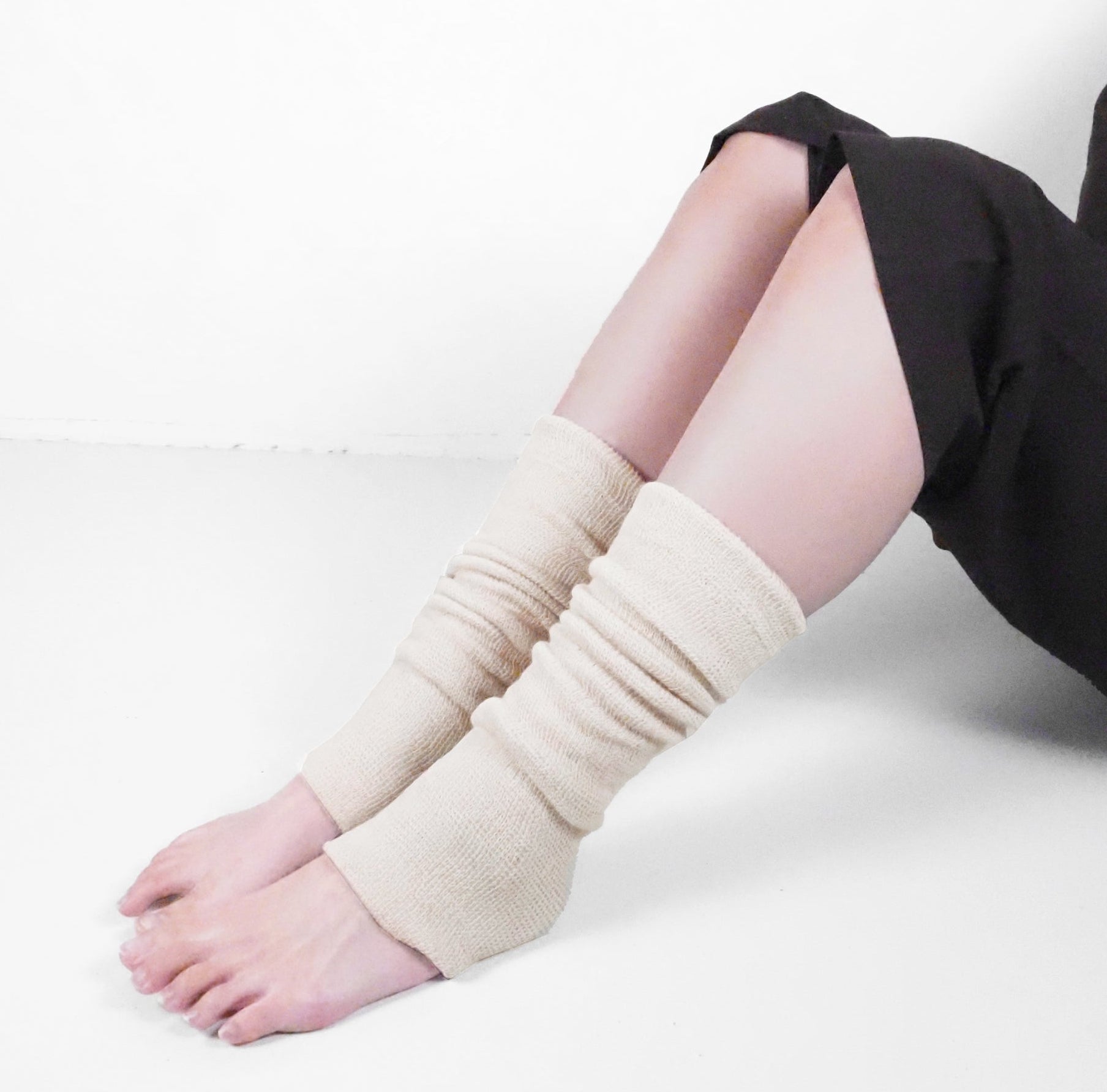 従来品(kinokotoの絹と炭のレッグウォーマー)に比べて、約半分程の薄さになったことで、お洋服にも響かずスッキリご着用頂けます。