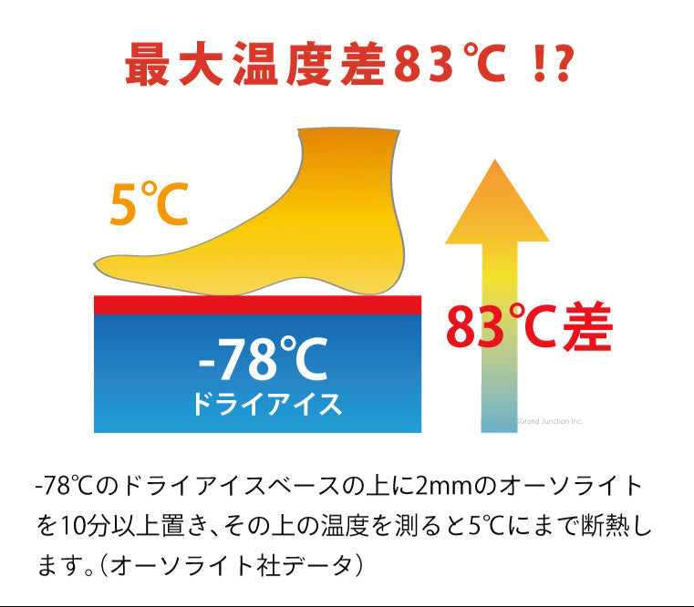 2層目には断熱オーソライトを使用。 耐久性があり、形状がへたれにくいOrthLite(オーソライト)に、多孔質なエアロゲルを配合することで、高い断熱性を発揮します。 ※-78℃のドライアイスベースの上に2mmの断熱オーソライトを10分以上置き、その上を測ると5℃までに断熱します。(オーソライト社データ)
